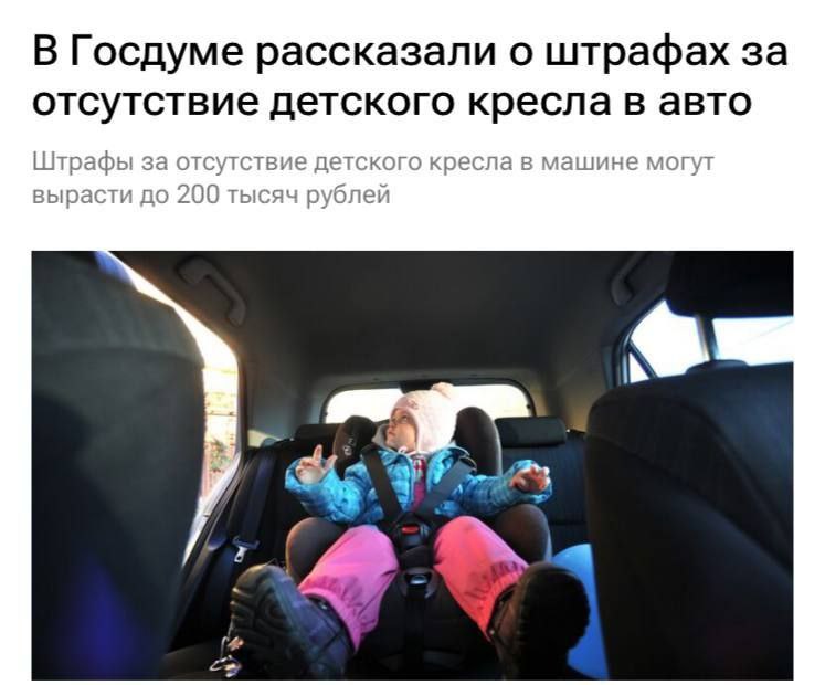 В России планируют существенно повысить штрафы за отсутствие детских автокресел в автомобилях. Согласно новому законопроекту, размер штрафа для водителей может вырасти с текущих 3 тысяч до 5 тысяч рублей, а для юридических лиц — до 200 тысяч рублей.