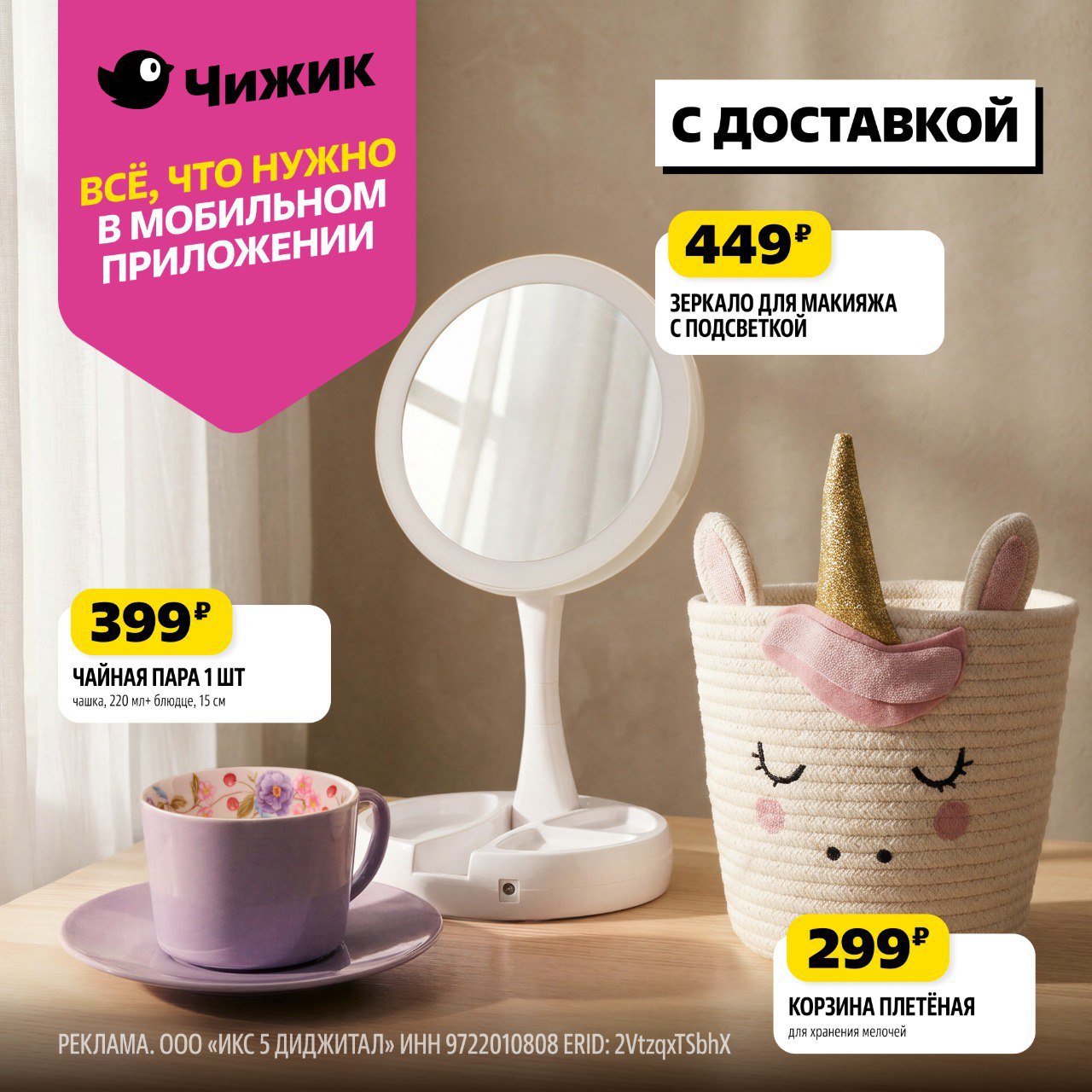 Товары для вашего дома уже ждут в разделе «Надо успеть» в приложении. Каждый четверг ловите там новые удачные находки по выгодным ценам. А «Чижик» доставит их вам прямо к двери в удобное время.