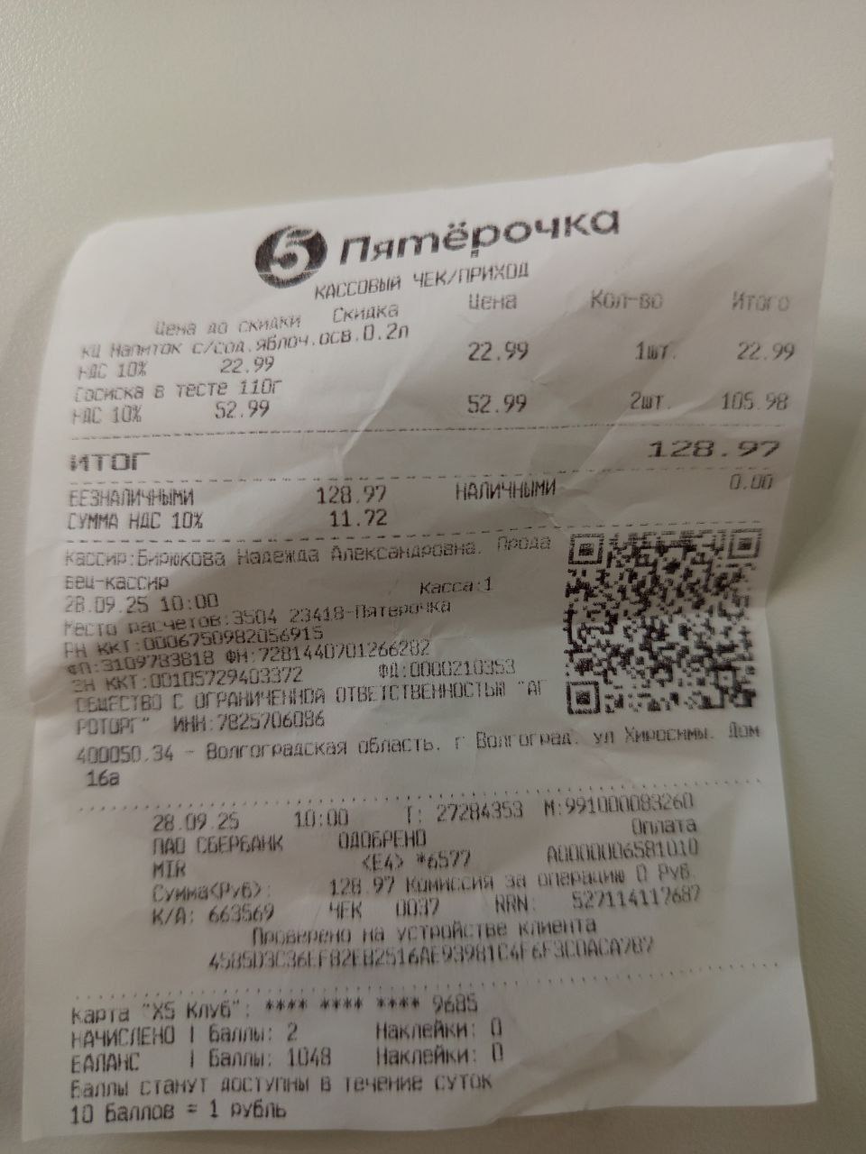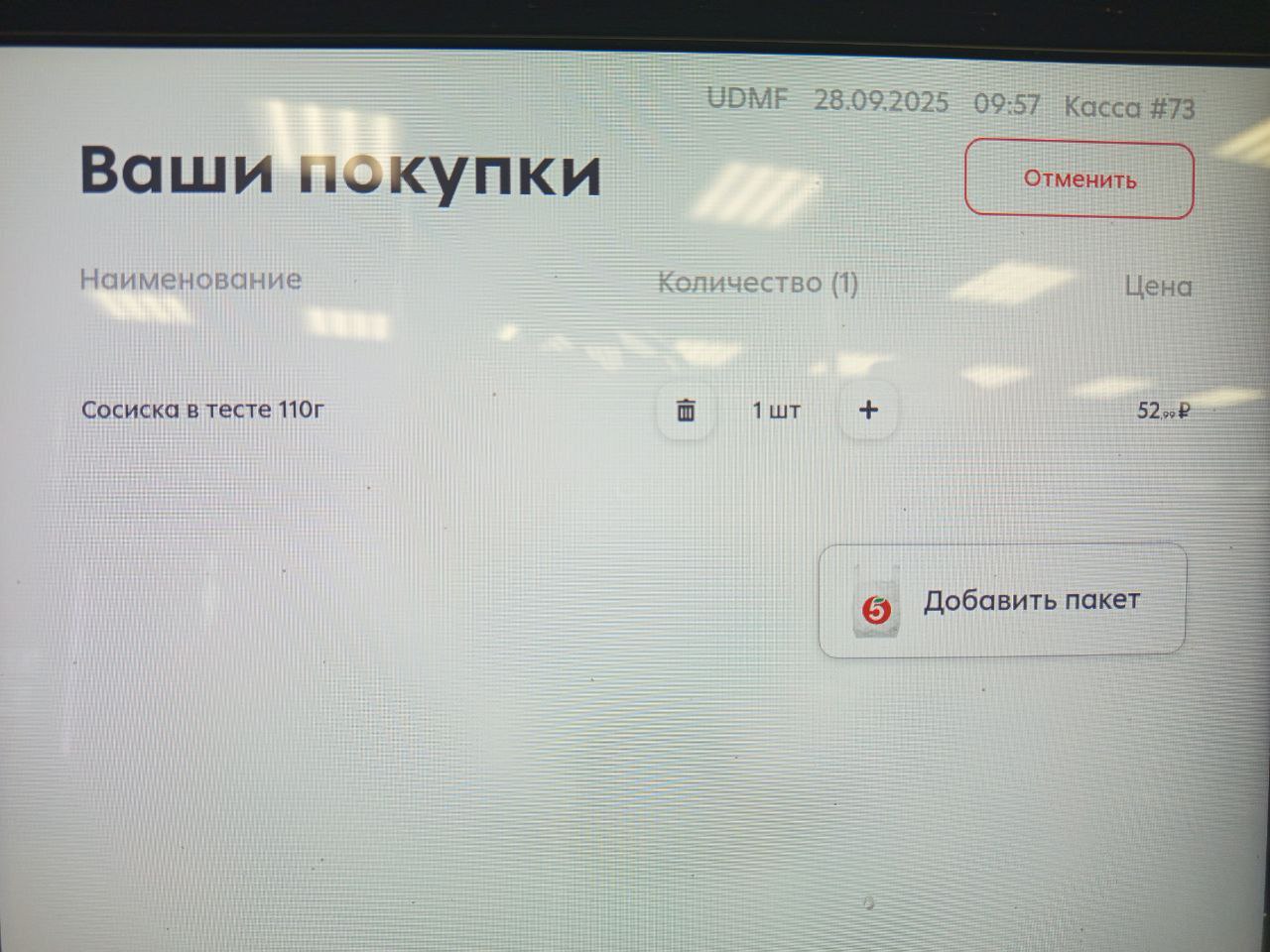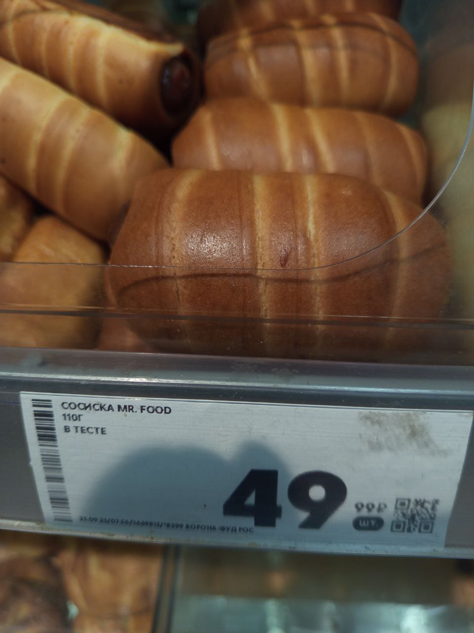 28 сентября 2025 года, примерно в 10:00 утра, при приобретении сосисок в тесте было обнаружено несоответствие между ценой, обозначенной на ценнике (49,99 руб.), и суммой, пробитой на кассе (52,99 руб.). Сотрудники магазина отказались реализовать товар по стоимости, указанной на ценнике.