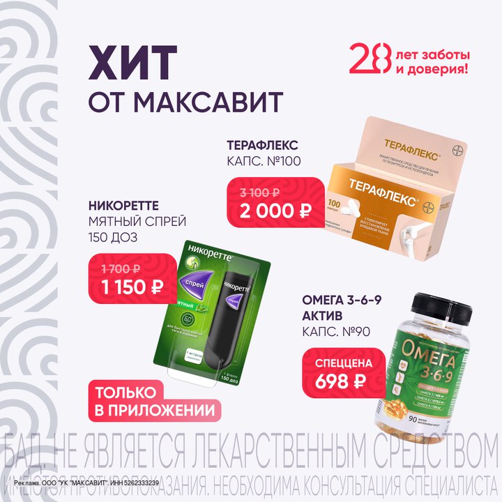 Также доступны дополнительные скидки на препараты Дюфалак, Супрадин и Дентамет. Все акции действуют исключительно в мобильном приложении Максавит и продлятся до 30 сентября включительно. Следим за данной ситуацией в нашем телеграм канале.