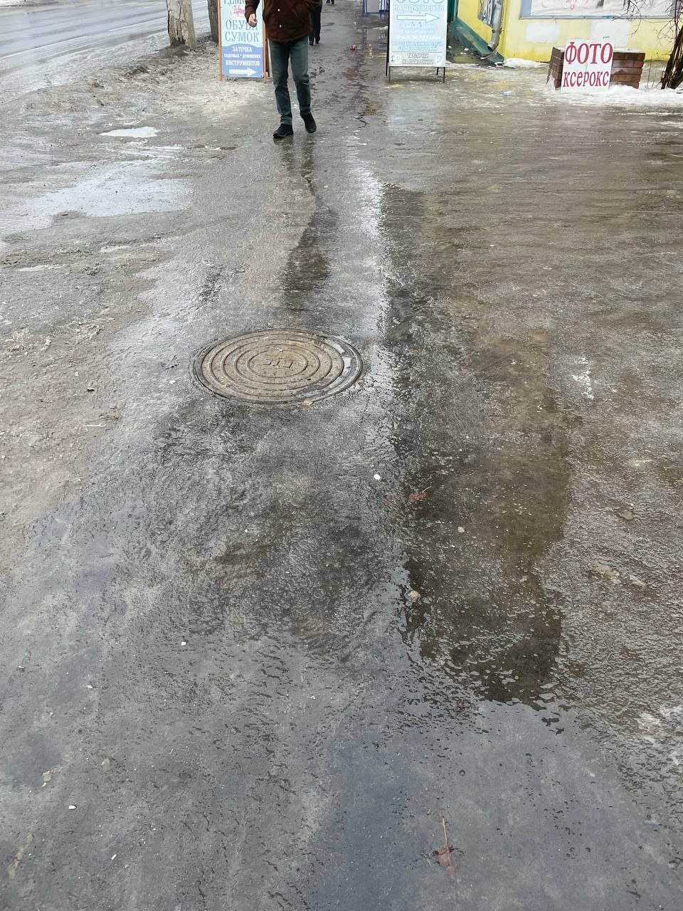 Несмотря на то, что всю ночь шел дождь, к 10:30 утра в районе не было замечено ни одной спецмашины или дворника. Горожане, направляющиеся на местный рынок, вынуждены передвигаться по льду.