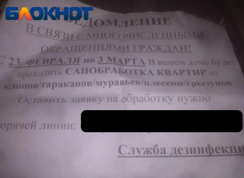 Жители южных районов Волгограда выражают недовольство агрессивным маркетингом служб по борьбе с насекомыми. По словам активистов, массовая расклейка объявлений часто предшествует появлению вредителей в многоквартирных домах. В связи с этим горожане предлагают пресекать деятельность дезинфекторов еще на стадии расклейки: уничтожать листовки и не впускать посторонних в жилую зону.