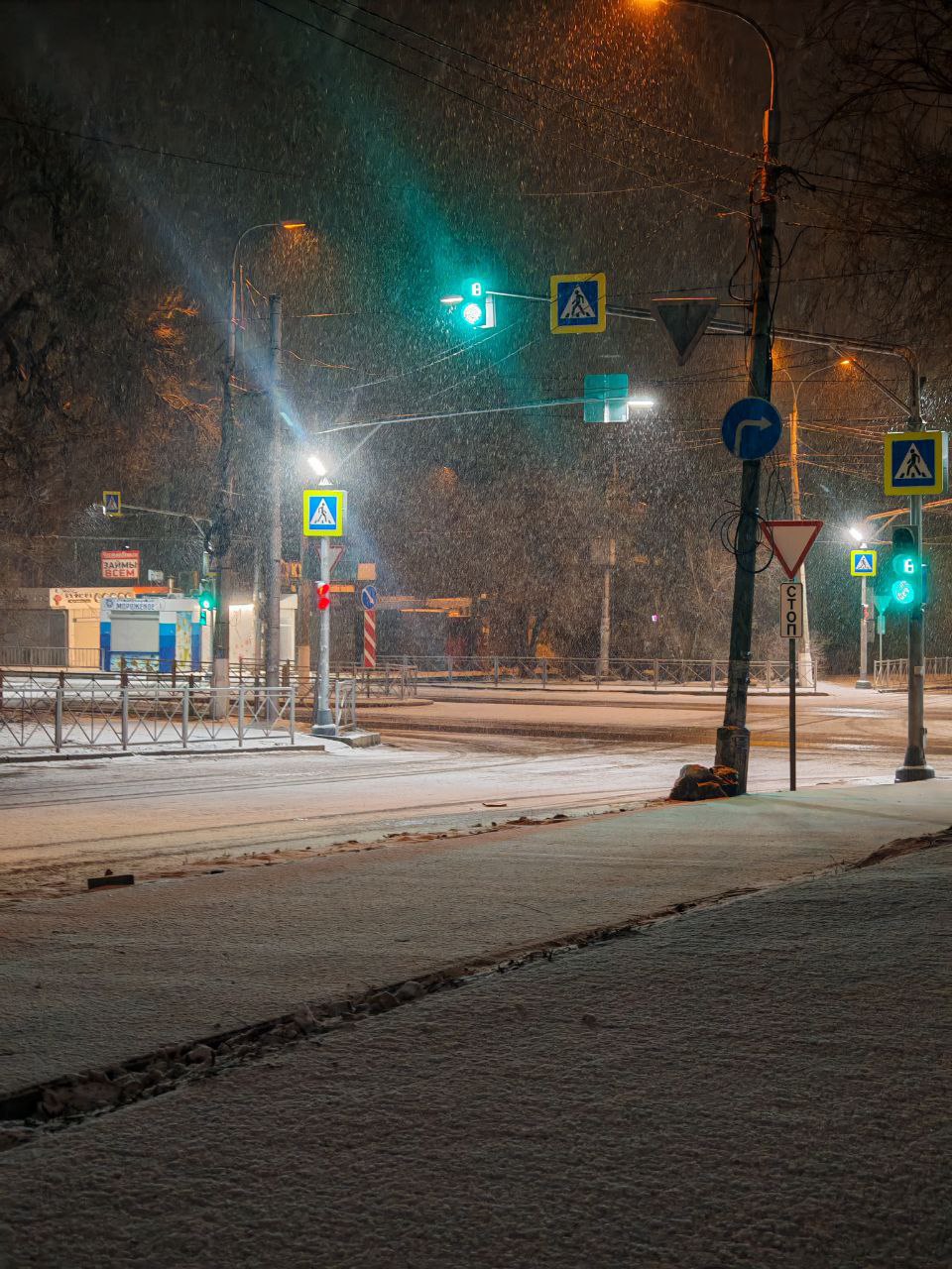 В течение ночи в городе наблюдался сильный снегопад, который значительно изменил городской пейзаж. Улицы, тротуары и уличные фонари оказались покрыты плотным слоем свежего снега.