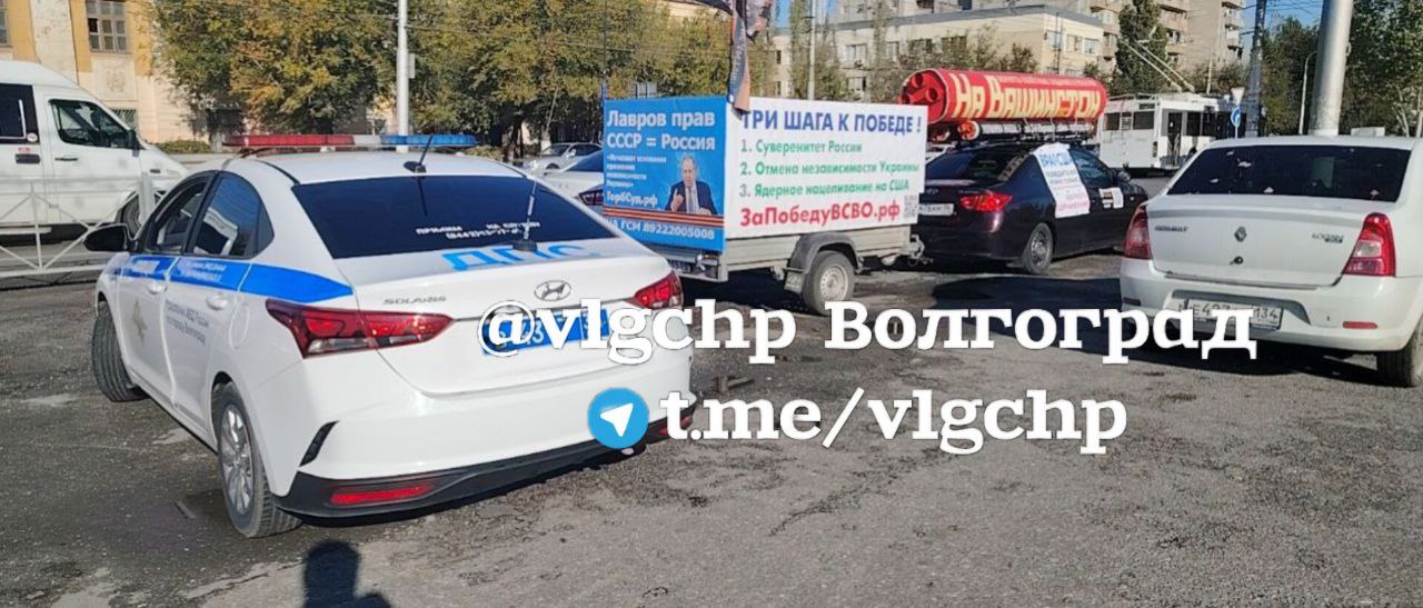 Патруль ДПС провел проверку ракетного аппарата у проходной Тракторного завода в Волгограде.